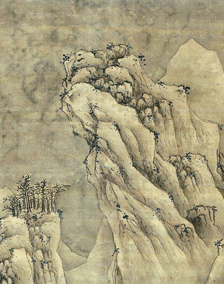 预计许多东谈主如故看到了,画中最岑岭山石裂缝处有厾点。蓝瑛用不同标的、不同大小的墨点强调雪山威望。