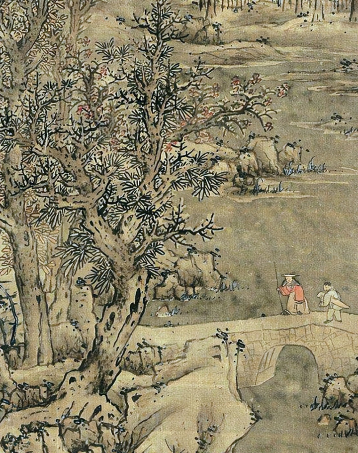 知谈了这是一幅雪景山水,那就望望蓝瑛在创作中有哪些亮点吧。布景晕染神采有专科的叫法,烘染法。先将画纸打湿,羊毫蘸取淡墨晕染布景。由于画纸名义如故有了一层水,每一笔淡墨落在纸上不会造成显明笔痕。整幅画的布景变得恶浊而又空灵,让虚的部分更虚,让实的部分更实,这即是烘染法达到的后果。