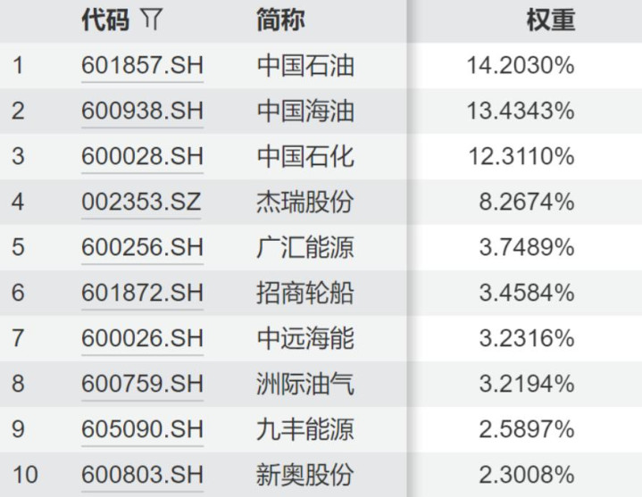 具体来看,前三大权重股中,中国石油(14.2%)、中国海油(13.4%)和中国石化(12.3%),这三家动力巨头的共计权重接近40%,对指数的走势有着决定性的影响。