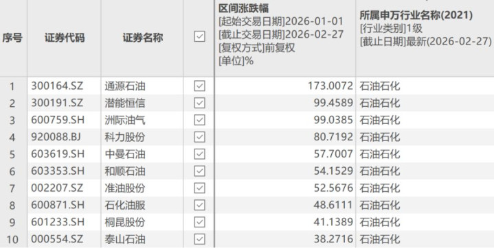 其中,通源石油年内股价涨超170%,潜能恒信、洲际油气等年内涨幅接近翻倍,另外还有多只个股录得50%以上升幅。