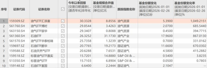 具体来看,石油ETF(561360.SH)、石油ETF鹏华(159697.SZ)等家具年内份额增长超11亿份,油气ETF汇添富(159309.SZ)份额也有超5亿份的增长。