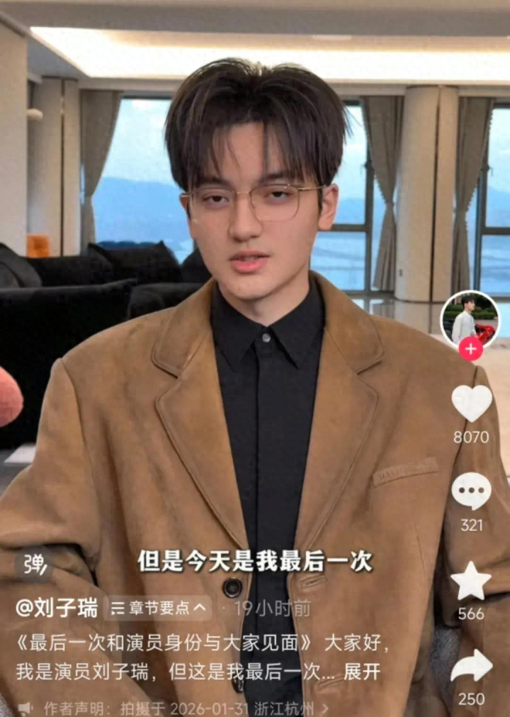 当晚,灯光柔和的镜头前,刘子瑞身着简约服饰,神情平静而坚定,面对屏幕向所有关注自己的人诉说退圈决定,这也是他最后一次以演员的身份与大众见面。“大家好,我是演员刘子瑞,但是今天是我最后一次,以这样的身份跟大家见面,因为从明天开始我将告别陪伴了我十年的职业。”他的话语平缓,没有过多情绪起伏,却藏着对过往十年的回望与释然。