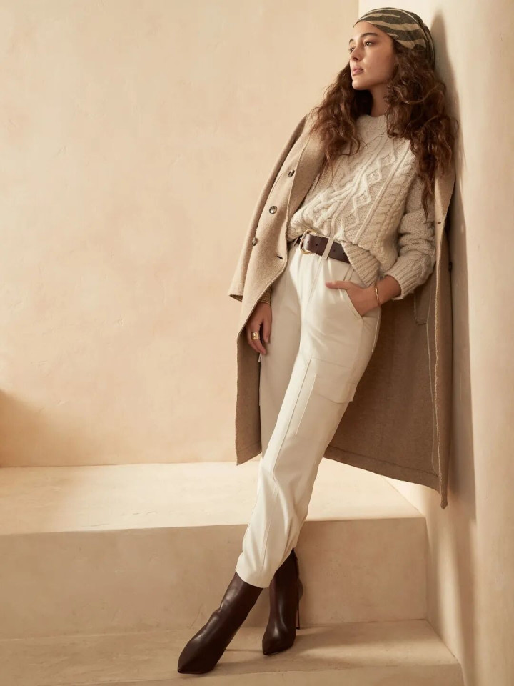 驼色毛衣配驼色高腰裤,外披一件长版大衣,视觉让你拉长五公分不啻。