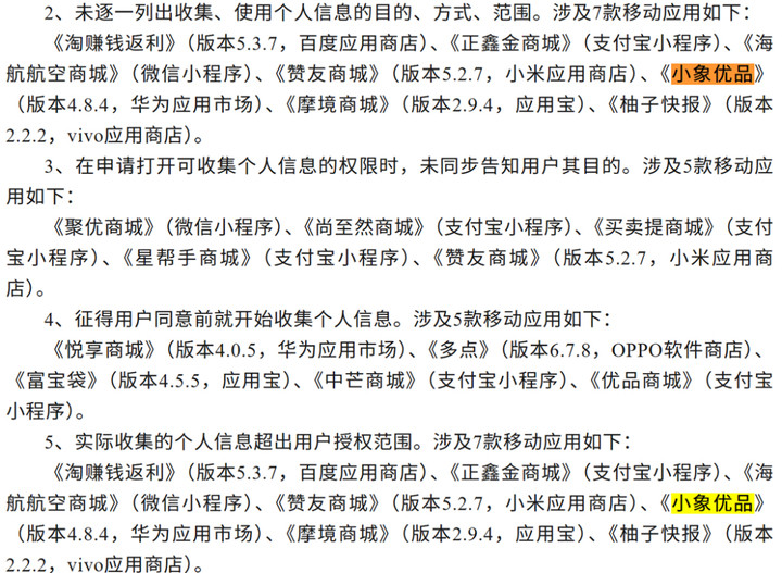 4月2日,国度汇集安全通报中心通报了37款出动诈欺存在犯罪违法采集使用个东说念主信息情况。其中小象优品等商城类诈欺被点名。通报泄漏,小象优品波及的问题包括未逐个列出采集、使用个东说念主信息的联想、模样、范围;实质采集的个东说念主信息超出用户授权范围。