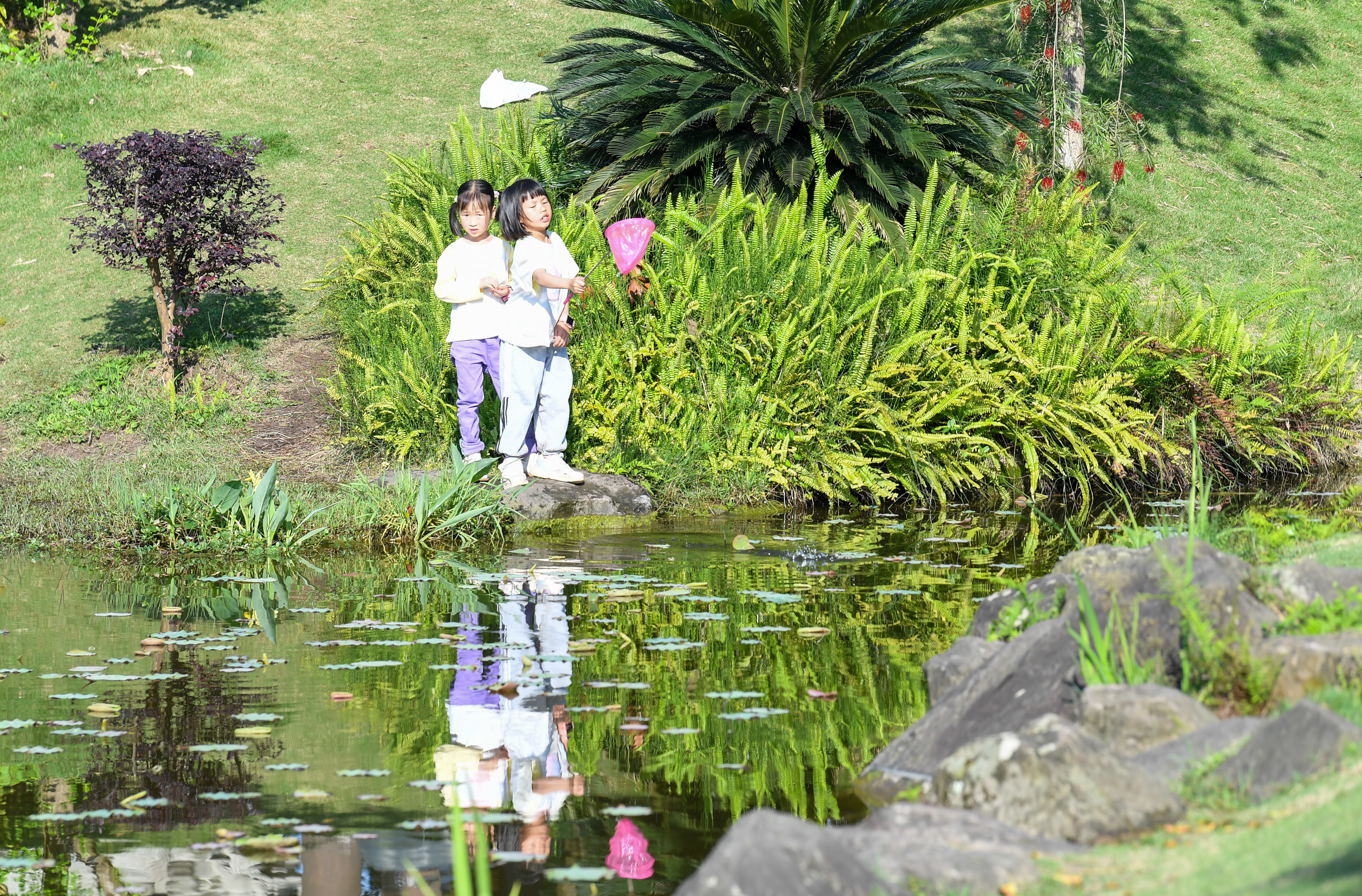 4月11日,小一又友在玉带河公园溪水边玩水。