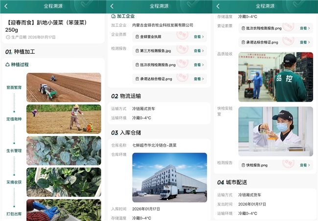 在产地直采基础上,七鲜超市通过自研的“食安品质全链路”溯源系统,将春菜的食品安全透明化、可视化。消费者只需点击七鲜APP或小程序商品页的“全程溯源”,就能清晰查看春菜从基地到门店的完整流通过程,包括基地资质、农残检测报告、物流温控数据、入库验收信息等关键内容。