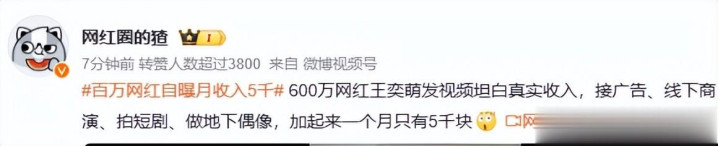 你敢信吗?一个拥有 600 万粉丝的网红,现在居然说自己一个月拼死拼活接广告、跑商演、拍短剧,加起来收入才 5 千块。