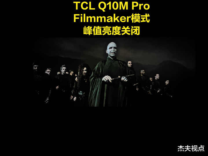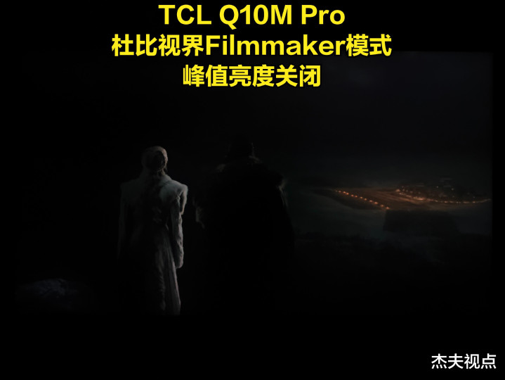 先不说这制作主谈主是否脑子进水,那么按照Filmmaker模式的磋商来看,电视应该尽量达到这样的画面才行,但实践上却远非如斯。咱们先使用TCL高端机型Q10M Pro在杜比视界Filmmaker模式下不雅看,况兼将峰值亮度分离确立为关闭、圭臬以及高,民众不错望望在不同峰值亮度下,Q10M Pro所发达出来的画面。