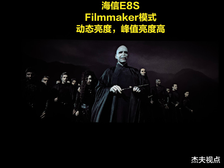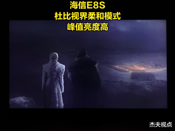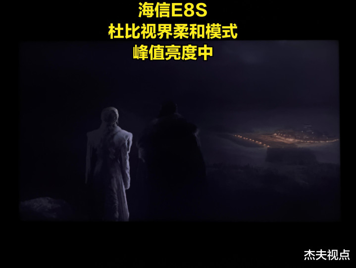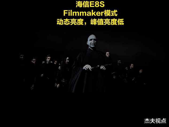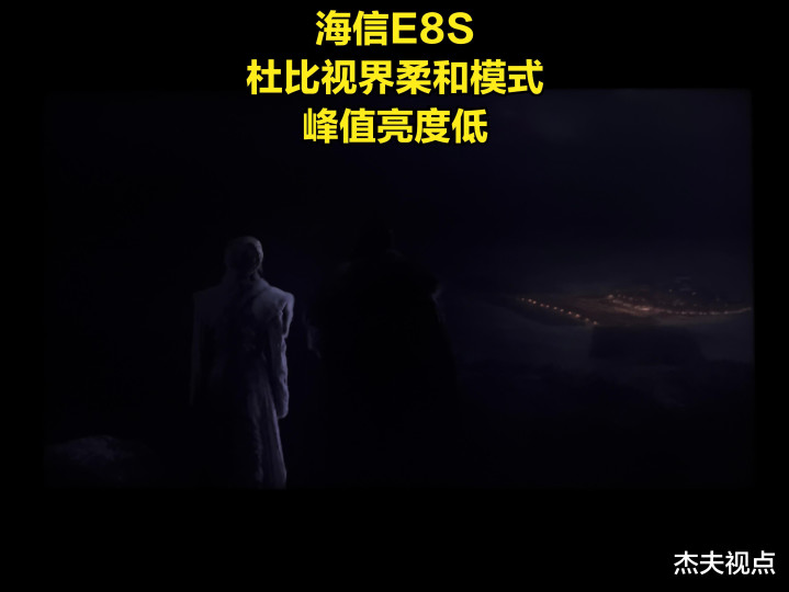 在杰夫视点搏斗的用户,极度是一些相对专科的用户,很追求规复制作主谈主意图的画面,包括要画面靠近原始视频的亮度。咱们并不放弃这样的念念路,包括咱们我方日常也可爱用Filmmaker模式以及杜比视界柔软模式看电视,可是当这种念念路遭受有一些“变态”的视频时,咱们会发现一个很大的问题:如真的要全都靠近原始亮度,那么像《哈利波特7》那种暗场亮度不算极点的场景还好,但如果遭受《猎杀本拉登》以及《权益的游戏》这种亮度极低的画面,那么电视呈现出来的画面很可能出现民众相等鄙弃的一种情况——死黑!