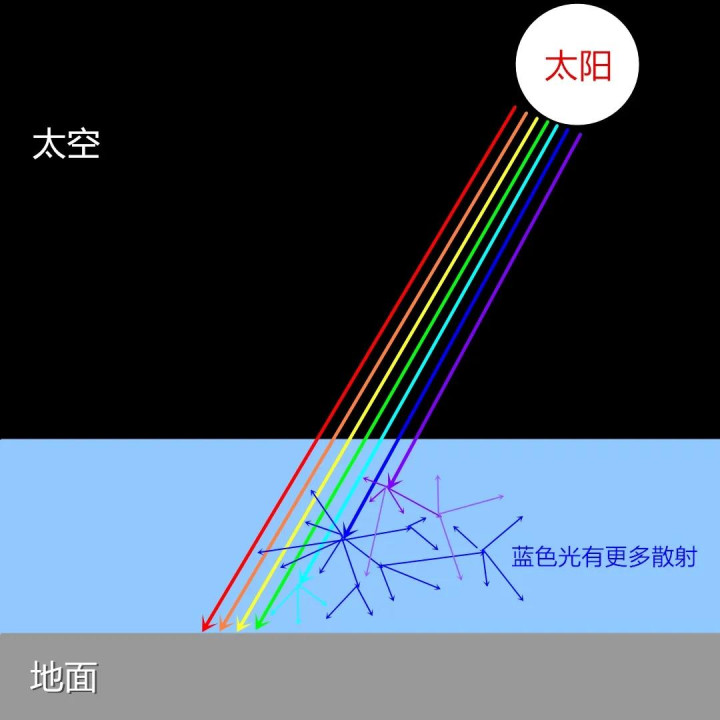 正因为如斯,当太阳光穿过大气层时,波长较短的蓝色光和紫色光会被无数散射,向四面八方传播,而波长较长的红色光、黄色光则更容易穿过大气层,沿着原来的标的传播。