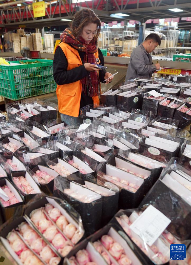 2月1日,发货仓工作人员在昆明的斗南花卉市场内检查鲜切花。春节将至,云南省昆明市斗南花卉市场人头攒动,人们选购年宵花、鲜切花等,各类花卉销售持续走俏。新华社发(梁志强摄)