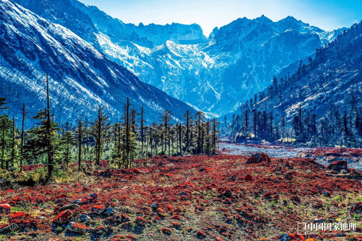 在四川贡嘎山下,有一种颜色让东谈主过目不忘。它不是雪山的白,也不是丛林的绿,而是岩石上那一抹防备的红。