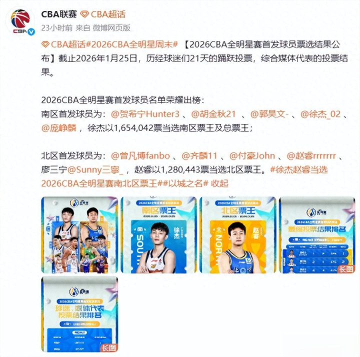 昨天,CBA联赛官方公布了2026CBA全明星赛首发球员名单。南区首发为贺希宁、胡金秋、郭昊文、徐杰、庞峥麟,北区首发为曾凡博、齐麟、付豪、赵睿、廖三宁。